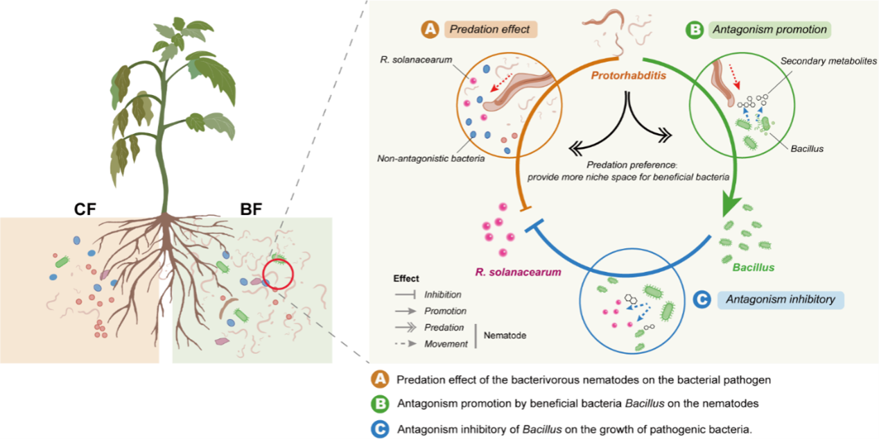 在该研究中,研究人员选择了三种施肥方案:不施肥、施用化学肥料和施用生物有机肥,以观察对土壤线虫群落组成、根际青枯菌丰度和作物病害的影响。结果发现,生物有机肥显著改变了线虫群落组成,增加了以细菌为食的线虫(如原杆线虫)的数量。进一步的试验显示,食细菌线虫优先以非拮抗性细菌为食,间接促进了拮抗性细菌(如芽孢杆菌)的生长。此外,食细菌线虫对拮抗性芽孢杆菌的捕食作用也引起了芽孢杆菌代谢功能的变化,从而有效抑制了青枯菌的生长。研究表明,食细菌线虫与拮抗性细菌之间的协同作用,可以显著减少植物病原菌的数量,而生物有机肥可以通过增加有益线虫的数量来塑造健康根际土壤微生物群落,这可能为植物提供了一种新的保护策略。