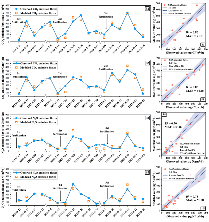 图3 CO2和N2O排放通量观测值与模拟值比较:稻田(B1和B2)为例