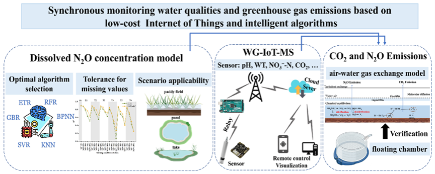 研究团队开发了一种基于物联网(IoT)和智能算法的水质和温室气体排放同步监测系统(WG-IoT-MS)。该系统配备了低成本传感器并集成了智能算法,能够实时监测溶解的N2O浓度。结合空气-水气体交换模型,该系统实现了对农业水体CO2和N2O排放的有效监测和模拟,并将监测成本降低了约 60%。研究成果为农业水环境和温室气体同步监测提供了一种新思路和新技术。
