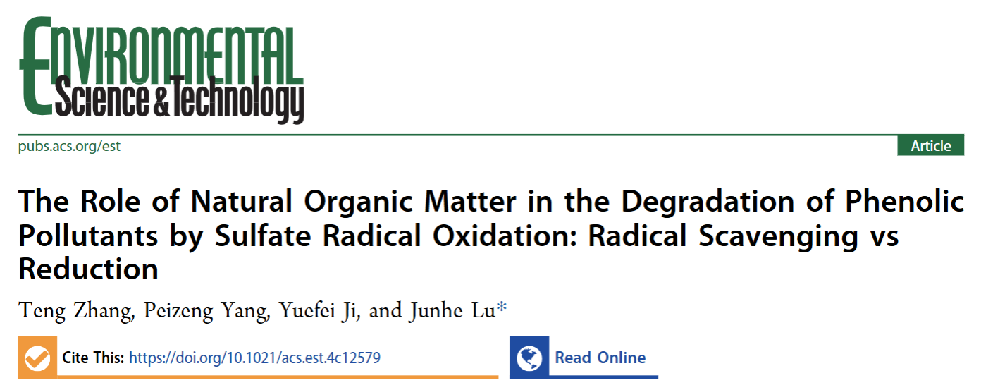 相关研究成果近日以“The Role of Natural Organic Matter in the Degradation of Phenolic Pollutants by Sulfate Radical Oxidation: Radical Scavenging vs Reduction”为题发表在期刊Environmental Science & Technology上。课题组博士生张藤为论文第一作者,陆隽鹤教授为论文通讯作者。研究得到了国家自然科学基金的资助。