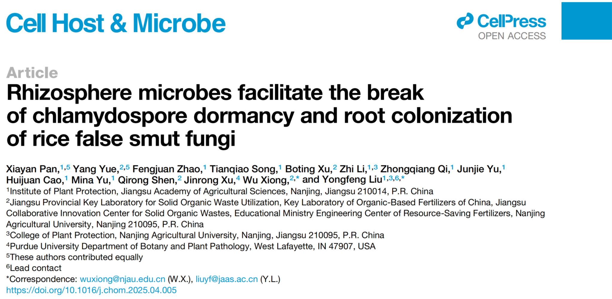 资环学院沈其荣院士团队熊武教授与江苏省农业科学院刘永锋研究员团队合作,在国际权威期刊《Cell Host & Microbe》发表题为“Rhizosphere microbes facilitate the break of chlamydospore dormancy and root colonization of rice false smut fungi”的研究论文。该论文系统性阐明了根际微生物调控稻曲病菌厚垣孢子打破休眠萌发并在水稻根部定殖机制,揭示了长期困扰行业领域内的“侵染源之谜”,证实了土壤中越冬后的厚垣孢子是稻曲病重要初侵染来源,为水稻抗病种质资源挖掘和病害的绿色防控提供了重要理论依据。