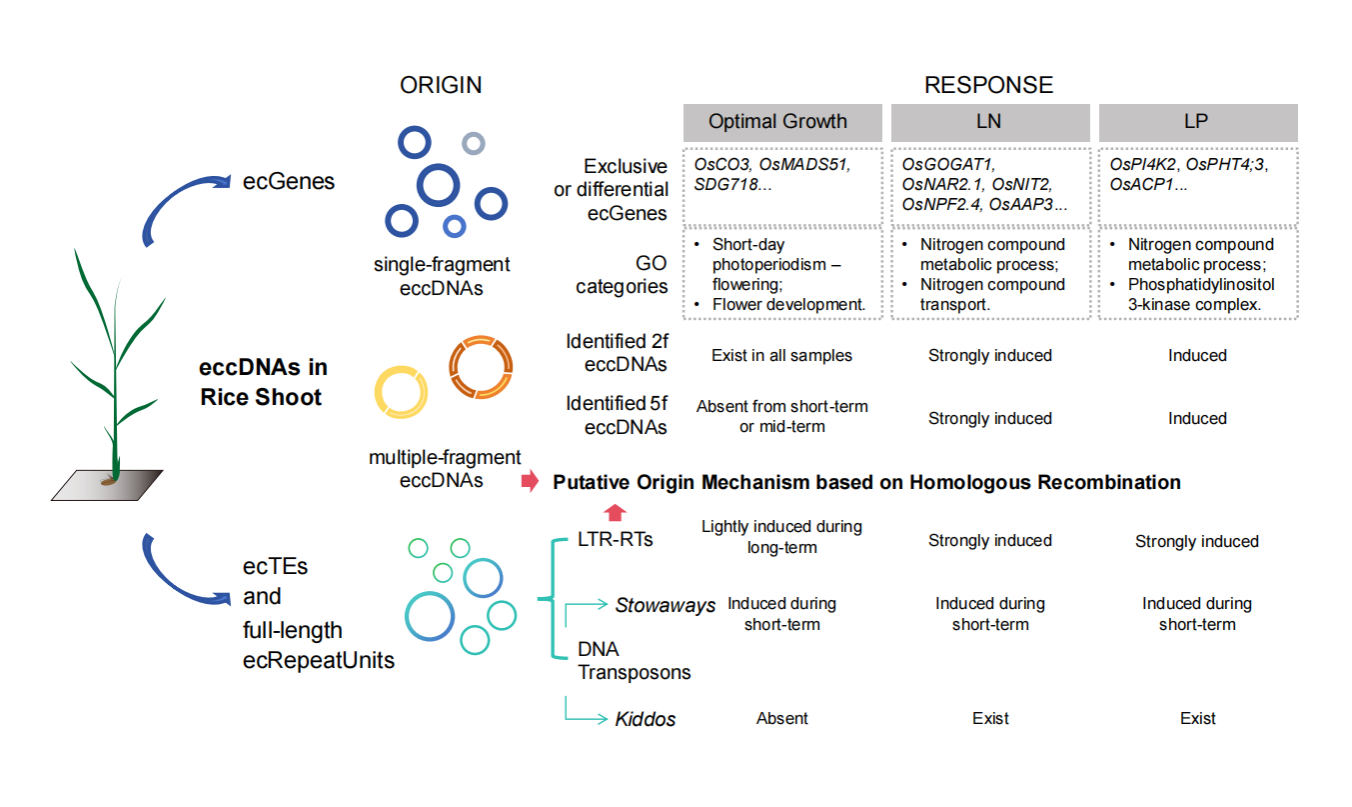 eccDNA是真核生物基因组可塑性的重要分子标志之一。尽管其在人类细胞中的功能已有较多研究,但植物eccDNA的生物学特性仍知之甚少。本研究以水稻为模式系统,通过系统比较不同生育期、正常生长与低氮和低磷胁迫条件下eccDNA的丰度动态与序列特征,首次揭示了植物eccDNA参与营养生长和响应养分胁迫的潜能,为挖掘作物养分高效利用新基因、利用基因组可塑性改良作物养分效率提供了新策略。