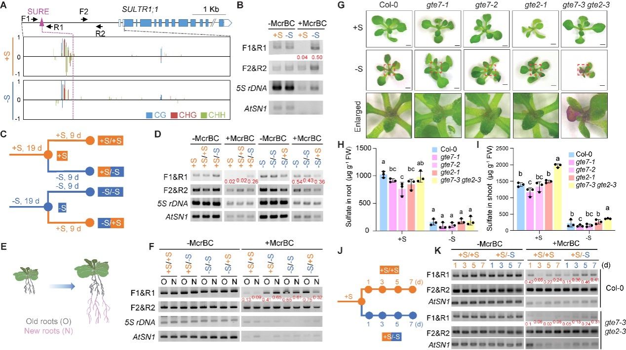 硫酸盐转运蛋白基因SULTR1;1启动子响应缺硫的动态甲基化及受GTE7/2的调控