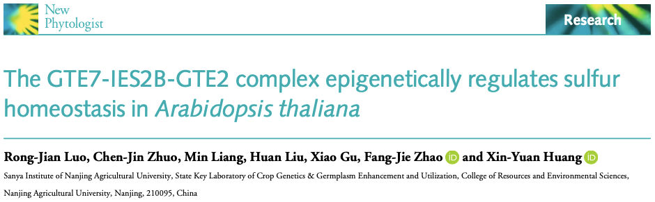黄新元教授团队在《New Phytologist》上在线发表了题为“The GTE7-IES2B-GTE2 complex epigenetically regulates sulfur homeostasis in Arabidopsis thaliana”的研究论文,揭示了拟南芥全局转录调控因子GTE7、GTE2以及染色质重塑因子IES2B组成的三元复合体,在表观遗传水平上调控硫素稳态的分子机制。