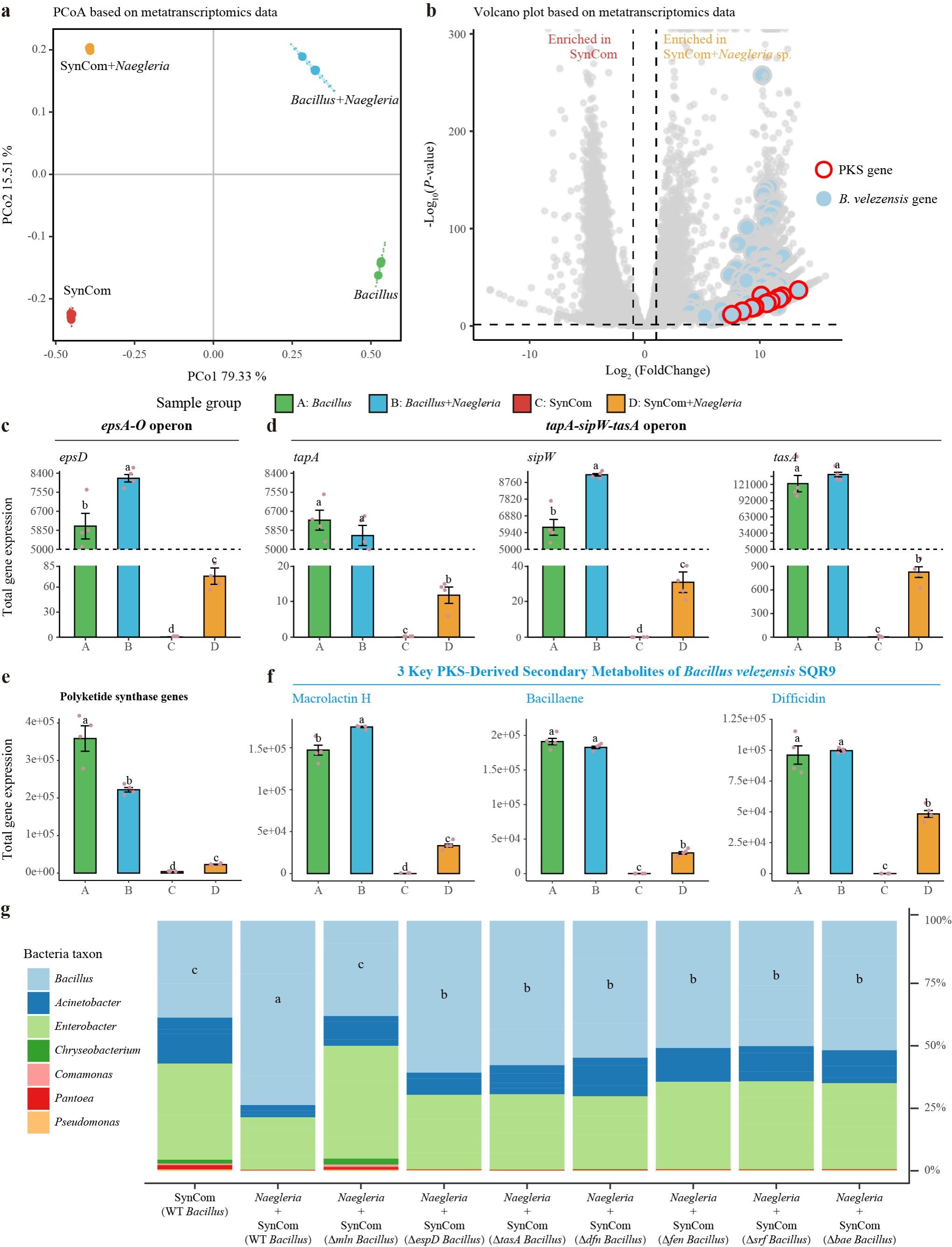 图1 土壤原生动物阿米巴Naegleria促进根际简化菌群中芽孢杆菌生物膜形成和次级代谢产物合成基因表达