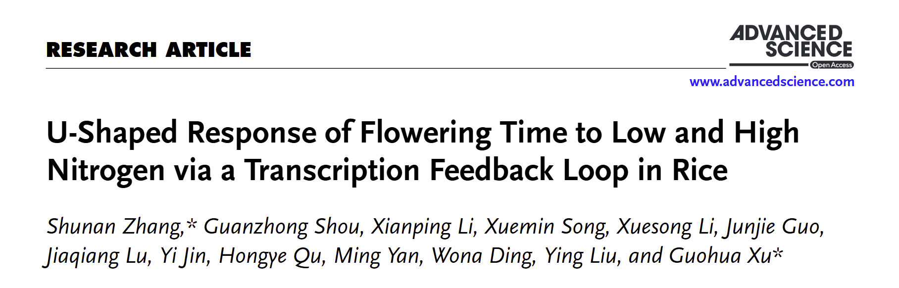 徐国华团队在国际权威期刊《Advanced Science》发表了题为“U-Shaped Response of Flowering Time to Low and High Nitrogen via a Transcription Feedback Loop in Rice”的研究论文。该研究揭示了一个由氮调控开花促进因子Nhd1与开花抑制因子Ghd7构成的转录负反馈调控环,作为精密的分子开关适应不同供氮状况,调控水稻抽穗期对氮肥响应的U-型模式。