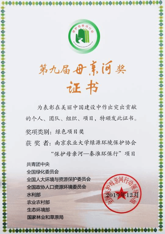 12月24日下午,由共青团中央、全国绿化委员会、全国人大环境与资源保护委员会、全国政协人口资源环境委员会、生态环境部、水利部、农业农村部、国家林业和草原局共同主办的第九届“母亲河奖”评选结果在北京隆重揭晓。玩偶姐姐 开展的“保护母亲河-秦淮环保行”项目脱颖而出,荣获绿色项目奖。