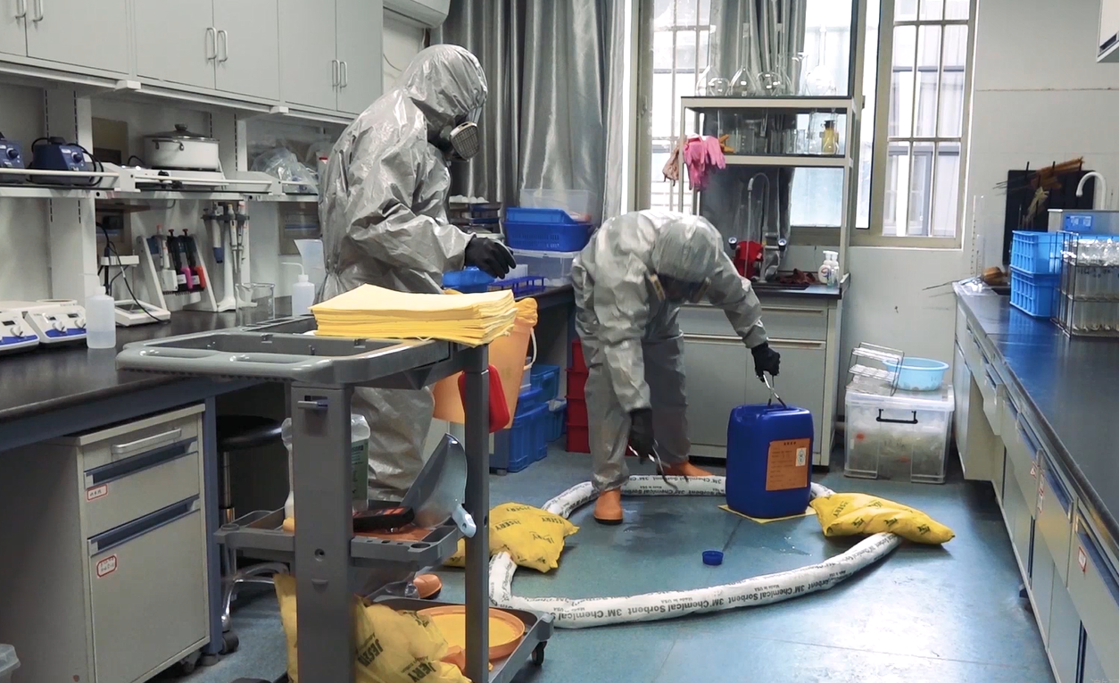 为落实学校《关于开展2020年“树牢安全发展理念,筑牢安全实验防线”实验室安全月活动的通知》,进一步提升师生安全意识,了解实验室安全应急设施,掌握实验室突发情况的处置技能,资环学院于11月12日举办危化品泄露应急演练暨专题讲座,院内外百余名师生参加。学院书记全思懋、副院长郭世伟及现场指导公司代表出席,活动由实验室基地处副处长石晓蓉主持。